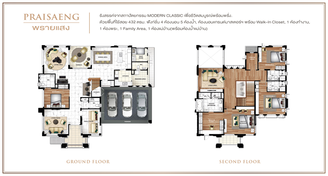 | 432 ตารางเมตร ฟังก์ชัน 4 ห้องนอน 5 ห้องน้ำ 1 ห้องทำงาน 1 ห้องพระ 1 Family Area 1 ห้องแม่บ้าน(พร้อมห้องน้ำแม่บ้าน) | |