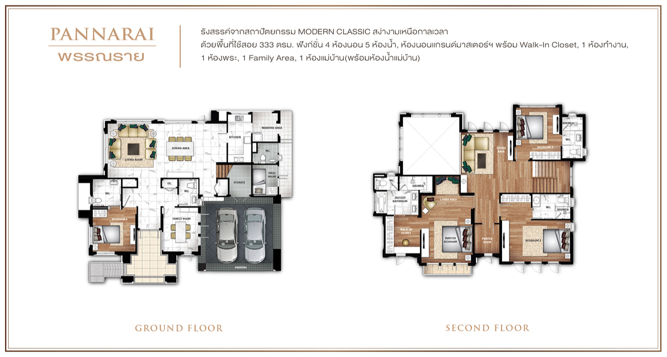 | 333 ตารางเมตร ฟังก์ชัน 4 ห้องนอน 5 ห้องน้ำ 1 ห้องทำงาน 1 ห้องพระ 1 Family Area 1 ห้องแม่บ้าน(พร้อมห้องน้ำแม่บ้าน) | |